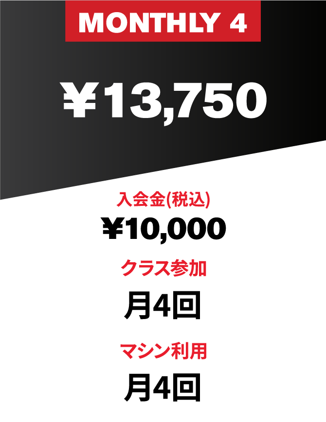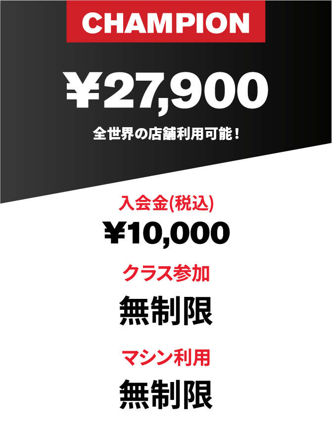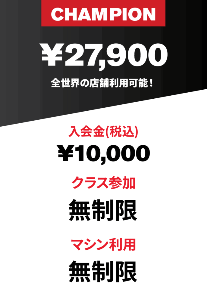 ※Champion Membershipには、水素水、リカバリールーム、レンタルロッカー、レンタルタオルが含まれています。※月会費にはレンタル費用は含まれておりません。※メンバーシップの変更・休会・退会はご契約日の前月15日までのお申し付けが必要です。※1クラスあたりのご利用金額は4,500円 (税込) です。